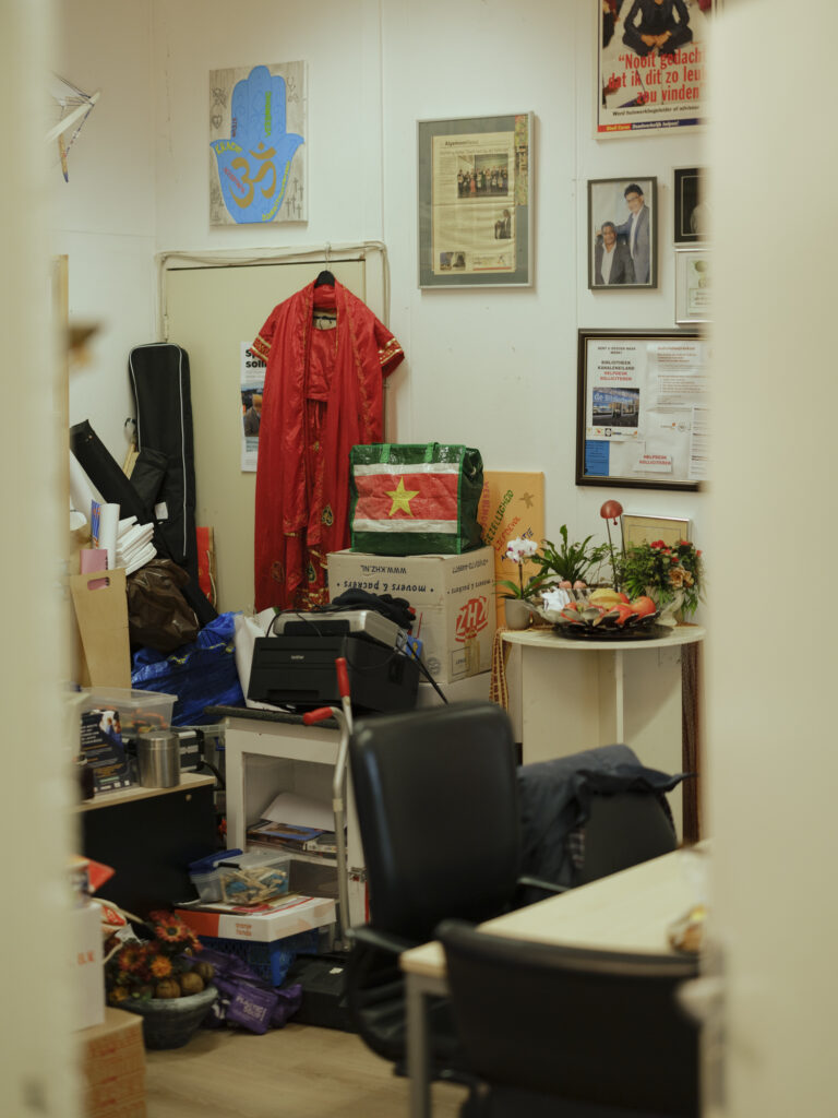 We zoeken Radj en Marije op in buurtcentrum De Oase, waar Radj zijn werkkamer voor Stichting Asha heeft. Een kleurrijke, volle kamer. De muur hangt vol met krantenartikelen, certificaten, oorkondes en foto’s van ontmoetingen. De hele linkerhelft van de kamer staat vol met spullen. Een grote stellingkast met onder andere lesmateriaal voor kinderen. Een glinsterend Surinaams-Hindostaans kostuum. Een trolley met daarin 10 laptops voor de lessen Digitale Administratie die vrijwilligers hier geven aan wijkbewoners, dit weer vanuit Digiwijs.
